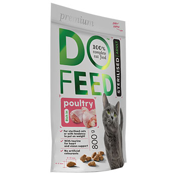 Dehidrēta mājputnu gaļa vismaz 16% (vista 83%, tītars 12%, pīle 5%), kukurūza, tritikāle, kukurūzas glutēns, kviešu klijas, mājputnu tauki, hidrolizētas vistas aknas, cukurbiešu graizījumi