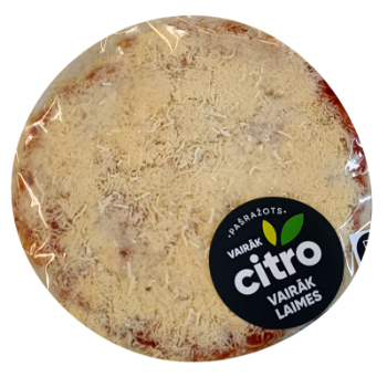 Sastāvdaļas :rauga mīkla (milti KVIEŠU ,cukurs,eļļa , raugs, pārtikas sāls),kečups ( tomātu pasta (18%), modificēta katupeļu ciete, konservanti: E211,820,stabilizētājs:8412,tomātu aromatizētajs) ,siera izstrādājums (pasterizēts PIENS,augu tauki(palmu)24%,konservants E252,siera ieraugs,pārtikas krāsviela-beta karotīns),raudene.100G produkta satur: enerģētiskā vērtība 1367 KJ/326 kcal, tauki 14 g , tostarp piesātinātās taukskābes 5 g, ogļhidrāti 35 g ,tostarp cukurs 4,5 g šķiedrvielas 1g, olbaltumvielas 15 g, sāls 1,4g. Pagatavošana: izņemt picu no iepakojuma.Cept cepeškrāsnī pie temperatūras +220 C ,aptuveni 6- 7 minūtes.