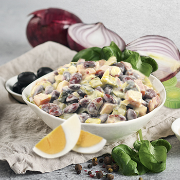 Sastāvdaļas: pupiņas, majonēze (rapšu eļļa, ūdens, OLU pulveris, VĀJPIENA pulveris, cukurs, modificēta ciete, sāls, skābuma regulētāji (etiķskābe, pienskābe), biezinātāji (modificēta ciete, guāra sveķi, ksantāna sveķi), konservanti (kālija sorbāts, nātrija benzonāts)), gurķi marinēti (gurķi, vīna etiķis, sāls, garšvielas (dilles, sīpoli, SINEPJU sēklas, piparu graudiņi), konservants: E211, dabīgs aromatizētājs, saldinātājs: E954), cūkgaļa ķūpināta (cūkgaļa 67%, kartupeļu ciete, stabilizētāji E451, E407, E425, E415, cūku olbaltumvielas, rīsu ciete, augu šķiedrvielas garšas pastiprinātājs E621, konservants E250, antioksidants E316, garšvielu ekstrakts), OLAS, puravs, melni malti pipari, pārtikas sāls. 100 g produkta satur: enerģētiskā vērtība 362KJ/88kcal, tauki 7g, tostarp piesātinātās taukskābes 1g, ogļhidrāti 1,9g, tostarp cukurs 1,1g, šķiedrvielas 0,2g, olbaltumvielas 3,8g, sāls 1,0g. Uzglab. temp.: +2..+6 C. Izlietot līdz: norādīts uz iep. Ražotājs: SIA Diāna Bistro, Andreja iela 5, Ventspils.