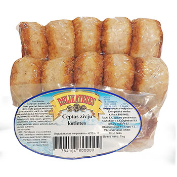 Sastāvdaļas: m,ehāniski atdalīta LAŠA maltā gaļa (lat. Salmo salar), (HEKA maltā gaļa (lat. Merluccius productus) 18%, vārīti rīsi, MENCAS maltā gaļa (lat. Gadus Macrocephalus) 13%, RĪVMAIZE (KVIEŠU milti, rapšu eļļa, kartupeļu ciete, sāls, pipari, garšvielu maisījums (sāls, cukurs, kaltēti dārzeņi), (burkāni, pastinaki, sīpoli, pētersīļi, kurkuma), kukurūzas putraimi). Uzturvērtība 100g produkta: enerģētiskā vērtība: kJ/kcal 672/160, tauki 7,4g, tostarp piesātinātās taukskābes 1,5g, ogļhidrāti 8,3g, tostarp cukurs 0,2g, olbaltumvielas 15,1g, sāls 1,3g. Pēc atvēršanas izlietot 48 stundu laikā. Zivis nozvejotas: LASIS — Norvēģijas zivju audzētavā, HEKS — Atlantijas okeāna dienvidaustrumu daļā (FAO47), MENCA — Arlantijas okeāna ziemeļaustrumi (FAO61) ar žaunu tīkliem. Uzglabāšanas temperatūra: +2…+6C.