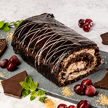 Sastāvdaļās:Biskvīts brūnais(OLAS,cukurs,KVIEŠU milti,kakao),ķiršu pildījums 50%,putkrējums uz augu tauku bāzes,vārīts iebiezināta piena pildījums,šokolādes mīkstā glazūra,šokolādes mīkstā glazūra -balta.