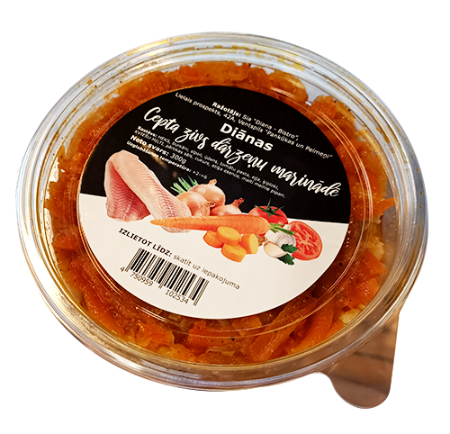 Sastāvdaļas: burkāni, zivs fileja 25%, sīpoli, tomātu pasta, augu eļļa, KVIEŠU milti, pārtikas sāls, cukurs, ķiploki, etiķa esence, melnie pipari.100 g produkta satur: enerģētiskā vērtība 604KJ/145kcal, tauki 7 g, tostarp piesātinātās taukskābes 1 g, ogļhidrāti 10 g, tostarp cukurs 5,2 g šķiedrvielas 1,3 g, olbaltumvielas 8,6 g, sāls 1,5 g.Uzglabāšanas temperatūra : +2…+6 C. Izlietot līdz: norādīts uz iepakojuma. Ražotājs: SIA Diāna Bistro, Andreja iela 5, Ventspils.