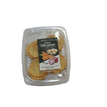 KVIEŠU milti, margarīns (augu eļļas (rapšu, palmu), ūdens, emulgatori (rapšu lecitīns; taukskābju mono- un diglicerīdi), skābuma regulētājs(citronskābe), aromatizētājs dabīgs, krāsviela (beta karotīns)), OLAS, universālā garšviela (sāls (61,7%), kaltēti dārzeņi (19%): burkāni, pastinaks, pētersīļi, sīpoli, dilles, selerija, paprika, ķiploks; cukurs, garšas pastiprinošās vielas: mononātrija glutamāts; kurkuma, melni pipari, hidrolizāts augu olbaltumvielu, tomātu pulveris, krāsvielas: riboflavīns), cukurs, cepamais pulveris(irdinātāji: dinātrija difosfāts E450i, nātrija karbonāts E500), pārtikas sāls.100 g produkta satur : enerģētiskā vērtība: 1928 KJ/463 kcal, tauki 30,3 g, tostarp piesātinātās taukskābes 14,9 g, ogļhidrāti 37,5 g, tostarp cukurs 1,5 g, šķiedrvielas 2,3 g, olbaltumvielas 8,8 g, sāls 1,5 g. Uzglab.temp.: istabas temperatūrā. Izlietot līdz: norādīts uz iepakojuma. Ražotājs: SIA Diāna Bistro, Andreja iela 5, Ventspils