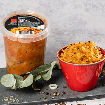 Sastāvdaļas:kāposti svaigi,kāposti skābēti,burkāni,sīpoli,tomātu pasta,ūdens,cukurs,augu eļļa,ķiploki,pārtikas sāls,melni malti pipari.Uzgl.+2 +6. Ražotājs SIA Bistro