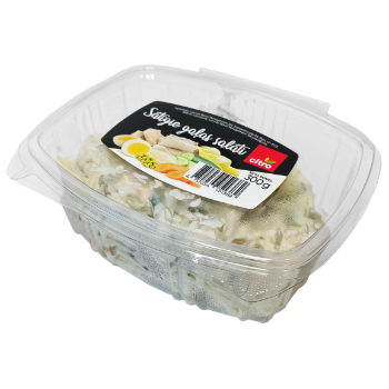 Sastāvdaļas: kartupeļi, majonēze (rapšu eļļa, ūdens, OLU pulveris, VĀJPIENA pulveris, cukurs, sāls, skābuma regulētāji (etiķskābe, citronskābe), konservants (kālija sorbāts), biezinātāji (modificēta ciete, guāra sveķi, ksantāna sveķi)), cūkgaļa 18%, konservēti zirnīši (zaļie zirnīši (70%), ūdens, sāls, cukurs), OLAS, burkāni, marinēti gurķi (gurķi, vīna etiķis, sāls, SINEPJU sēklas, konservants: E211; dabīgs aromatizētājs, saldinātājs: E954), gurķi, sāls, SINEPES (ūdens, SINEPJU pulveris 24,9%, cukurs, rapšu eļļa, sāls, skābuma regulētājs (etiķskābe), citrusaugļu šķiedra, garšvielas), melni malti pipari. 100 g produkta satur: enerģētiskā vērtība 850KJ/205kcal, tauki 17g, tostarp piesātinātās taukskābes 2,2g, ogļhidrāti 6,4g, tostarp cukurs 1,5g, šķiedrvielas 1,1g, olbaltumvielas 6,2g, sāls 1,4g. Uzglabāšanas temperatūra: +2…+6 C. Izlietot līdz: norādīts uz iepakojuma. Ražotājs: SIA Diāna Bistro, Andreja iela 5, Ventspils.