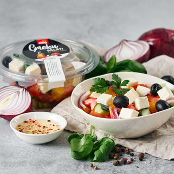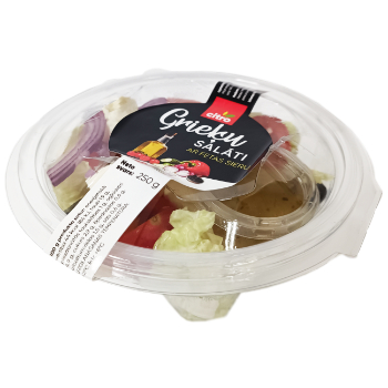 Sastāvdaļas: zaļie salāti, tomāti, SIERS Feta (pasterizēts govs PIENS, pienskābes baktērijas, mikrobu ferments), paprika, olīvas, salātu mērce (ūdens, cukurs, sāls, skābuma regulētāji (etiķskābe, trikālija citrāts, citronskābe, ābolskābe, askorbīnskābe), stabilizētājs (karagināns), garšvielas, konservants (kālija sorbāts), aromatizētāji), sīpoli.100g produkta satur: enerģētisko vērttību : 630KJ/152kcal, tauki 13g, tostarp piesātinātās taukskābes 3,1g, ogļhidrāti 4,6g , tostarp cukurs 2,1g , olbaltumvielas 3,5g, sāls 0,7g. Uzglab.temp.: +2…+6 C. Izlietot līdz: norādīts uz iepakojuma. Ražotājs: SIA Diāna Bistro, Andreja iela 5, Ventspils.