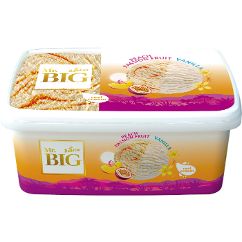 krējuma saldējums 90% (ūdens, SALDAIS KRĒJUMS, cukurs, VĀJPIENA pulveris, SVIESTS, SŪKALU pulveris, stabilizatori – baltās akācijas sveķi, guāras sveķi; emulgators – taukskābju mono- un diglicerīdi, aromatizētājs – vaniļa, vanilīns), persiku-marakujas pildījums 10% (cukurs, ūdens, glikozes un fruktozes sīrups, persiku biezeņa koncentrāts 12%, citronu sulas koncentrāts, marakujas sulas koncentrāts 3%, kukurūzas ciete, biezinātājs – pektīns, aromatizētājs, kurkumas un paprikas ekstrakts, pārtikas krāsviela – burkānu koncentrāts).