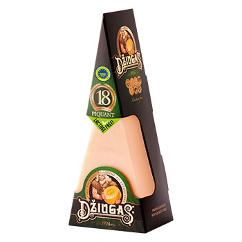 Cietais siers DŽIUGAS® PIQUANT, briedināts 18 mēnešus. 4 sastāvdaļas: piens , sāls, Ieraugs un augu izcelsmes ferments. Sastāvā nav konservantu un krāsvielu! 100% Dabīgs – Siera garša, kā arī krāsa ir pilnīgi dabīga. BEZ LAKTOZES. PIEMĒROTS VEĢETĀRIEŠIEM. Ar bagātīgu, asu garšu, maigi sajūtamu žāvētu augļu garšu. Smalku kraukšķīgumu dod atsevišķie kalcija sāls kristāliņi, kas liecina, ka sācies jauns siera nobrieduma posms. Pievienojot medu un pasniedzot ar vīnogām, olīvām, riekstiem, lieliski derēs kopā ar izvēlēto atspirdzinošo vīnu. Pievienojiet dažādiem salātiem, makaroniem, rīsu ēdieniem un pelmeņiem, piešķiriet pikantumu vistas, teļa vai pīles gaļas ēdieniem.